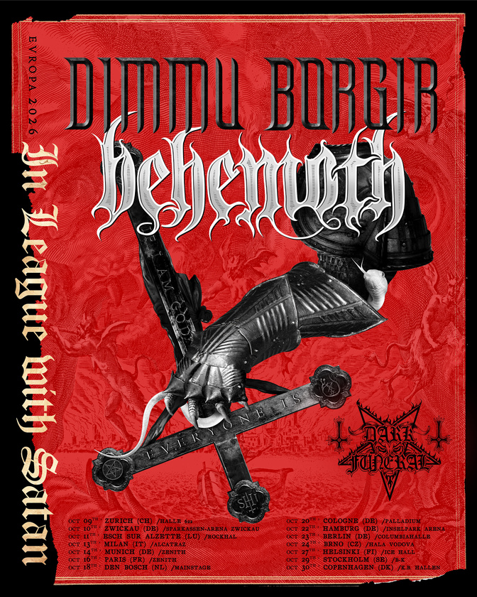 In October 2026, two of the most influential forces in extreme metal join together for a monumental live assault: DIMMU BORGIR and BEHEMOTH will embark on the 'In League With Satan' Co-Headline Tour, storming across Europe and the UK. As special guests, the Swedish black metal icons Dark Funeral will add even more ferocity to an already devastating lineup.