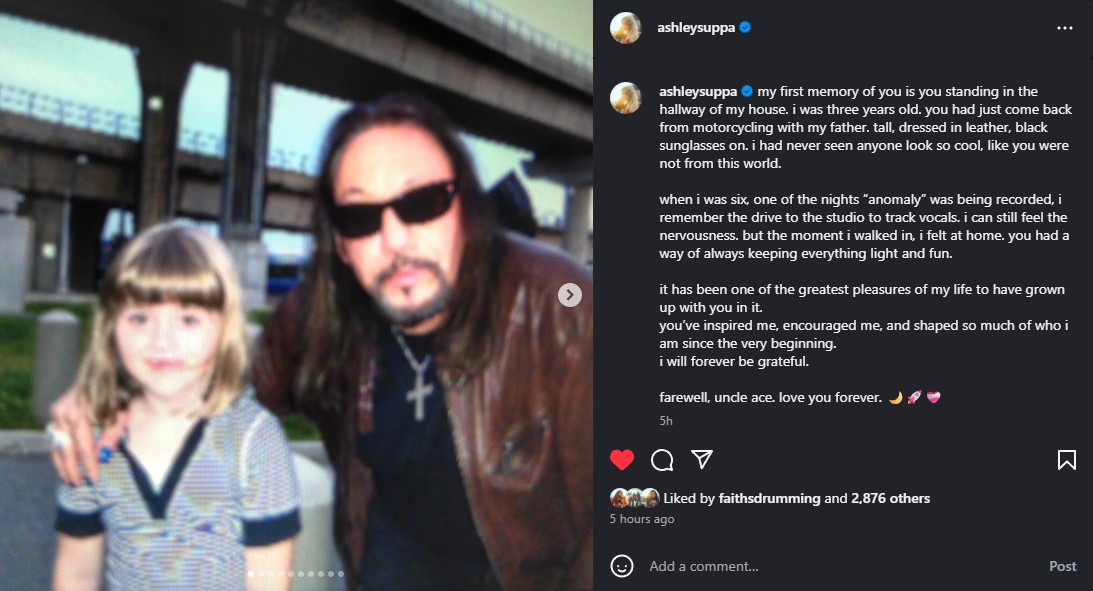 Ace Frehley was a longtime family friend to Plush bassist and backing vocalist Ashley Suppa. In fact, she made her recording debut singing on "A Little Below the Angels" from his Anomaly album. She posted this in Instagram this morning. I'm glad Ashley was in Arizona visiting her close friend and bandmate, Faith Powell, when she got this news.